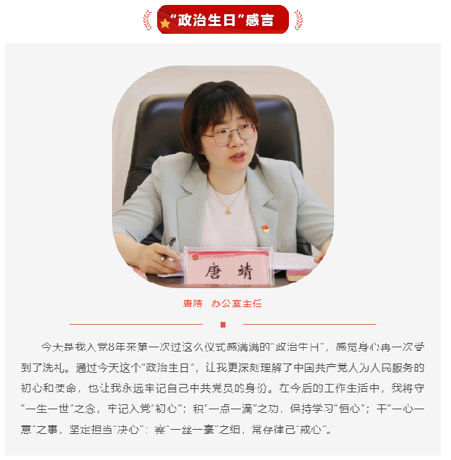 活动中,5名同志发表了“政治生日”感言,许下“生日愿望”。入党时的热血澎湃还在胸中激荡,一字一句肺腑之言让现场氛围庄重而热烈。从青葱年华一路走来,岁月沉淀的有历练后的成熟,还有历久弥坚的拳拳初心。