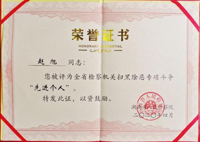 黑恶势力是生长在老百姓身边的毒瘤,百姓对此深恶痛绝。2018年,全国“扫黑除恶”专项斗争集结号吹响,赵旭首当其冲成为邵阳市检察院扫黑除恶工作组核心成员,承担了重大疑难案件办理和对基层检察院的指导工作。专项斗争开展以来,赵旭共办理有重大影响的涉黑案件5件、涉恶案件10余件,先后三次参与对全市检察机关扫黑除恶案件的督查指导。作为市检察院督办责任人,指导办理了新邵曾健朋、隆回肖正红、新宁龙海波、大祥雷海祥等一批涉黑专案,督办涉恶案件十余件,为全市扫黑除恶工作作出了突出贡献。先后被省院、市院评为“扫黑除恶”专项斗争先进个人,被省院记二等功。
