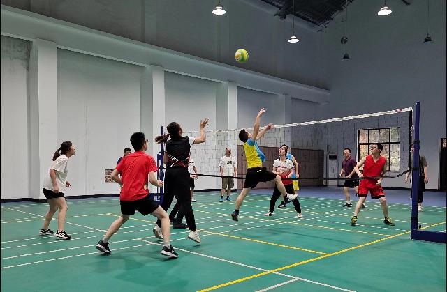 气排球比赛按部门分成4支队伍,采用男女混合3+2的方式。