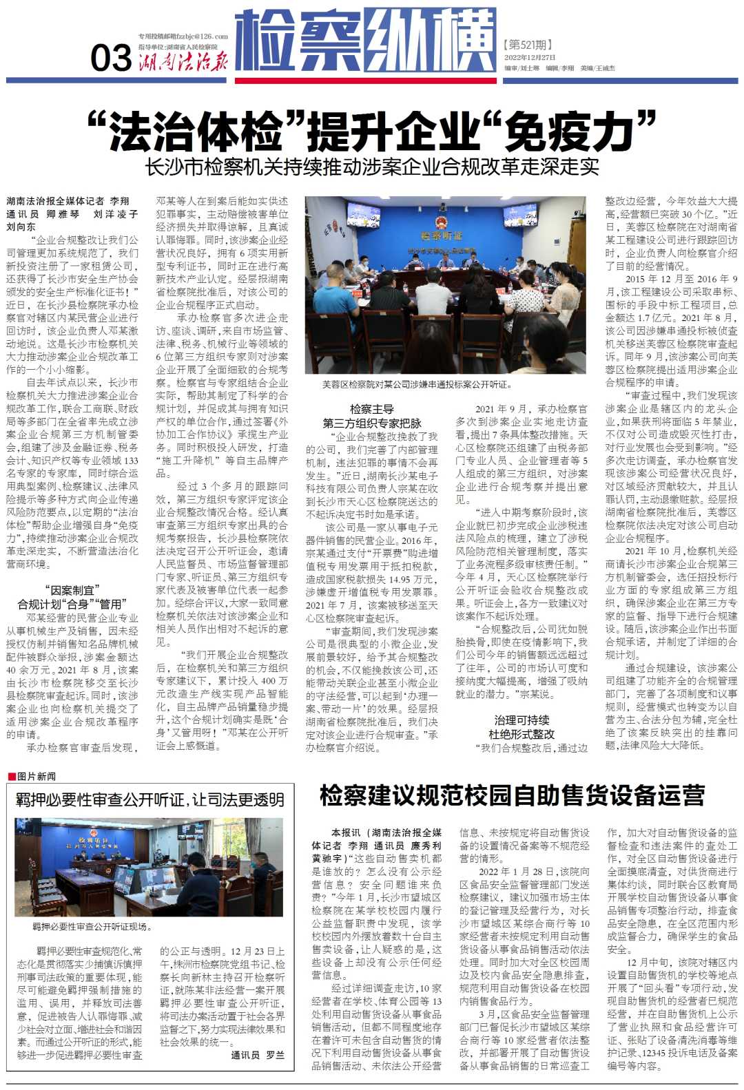 自去年试点以来,长沙市检察机关大力推进涉案企业合规改革工作,联合工商联、财政局等多部门在全省率先成立涉案企业合规第三方机制管委会,组建了涉及金融证券、税务会计、知识产权等专业领域133名专家的专家库,同时综合运用典型案例、检察建议、法律风险提示等多种方式向企业传递风险防范要点,以定期的“法治体检”帮助企业增强自身“免疫力”,持续推动涉案企业合规改革走深走实,不断营造法治化营商环境。