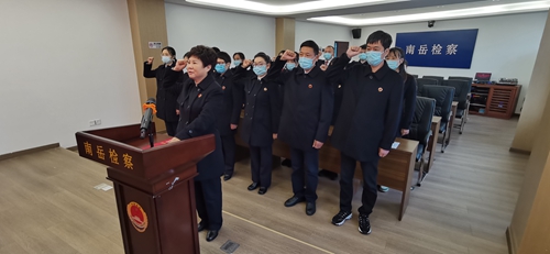 党组书记、检察长凌立新在宣誓仪式上讲话并提出三点要求:一是筑牢忠诚之魂,确保正确政治方向。要把学习宣传贯彻党的二十大精神作为首要政治任务,忠诚拥护“两个确立”,坚决做到“两个维护”,自觉把讲政治贯穿到南岳检察各项工作的全过程,忠诚履行宪法法律赋予的各项职责。 二是弘扬宪法精神,围绕中心服务大局。全体检察人员必须践行宪法精神,在工作岗位上恪尽职守、公正司法、砥砺奋进,在攻坚克难中彰显担当,在狠抓落实中展现作为。三是树立廉洁之风,心怀敬畏坚守底线。全体检察人员要时刻增强廉洁自律精神,清白做人、干净做事,坚决杜绝不正之风和腐败问题,做到心正廉洁、身正刚直,切实赢得群众的支持和信赖。