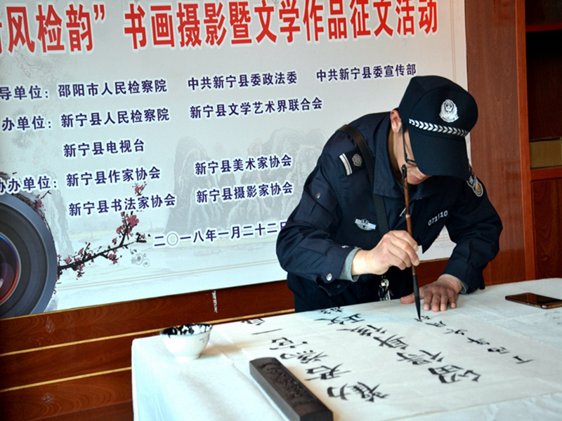 1月22日,新宁检察院举办了“清风检韵”书画摄影笔会暨文学作品有奖征文活动,特邀了中国书法家协会、中国美术家协会等21名书画名家助推检察文化建设,全院书画爱好者积极踊跃参与,其中一位保安特别引人注目,他的书法作品震撼了所有在场观看的检察干警,他就是邵阳市书法家协会会员、新宁县书法家美术家协会会员、新宁检察院保安周继荣。