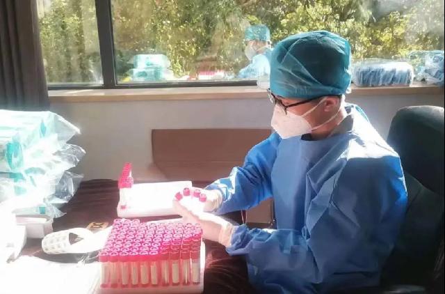 检察二部罗彪在摩登酒店隔离点给核酸检测试管分贴标签