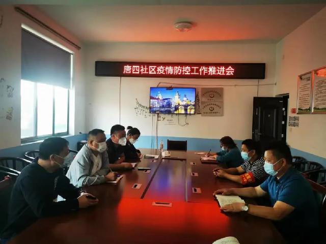 陈超军(右一)、陈雪纯(左一)与社区干部一起部署疫情防控工作